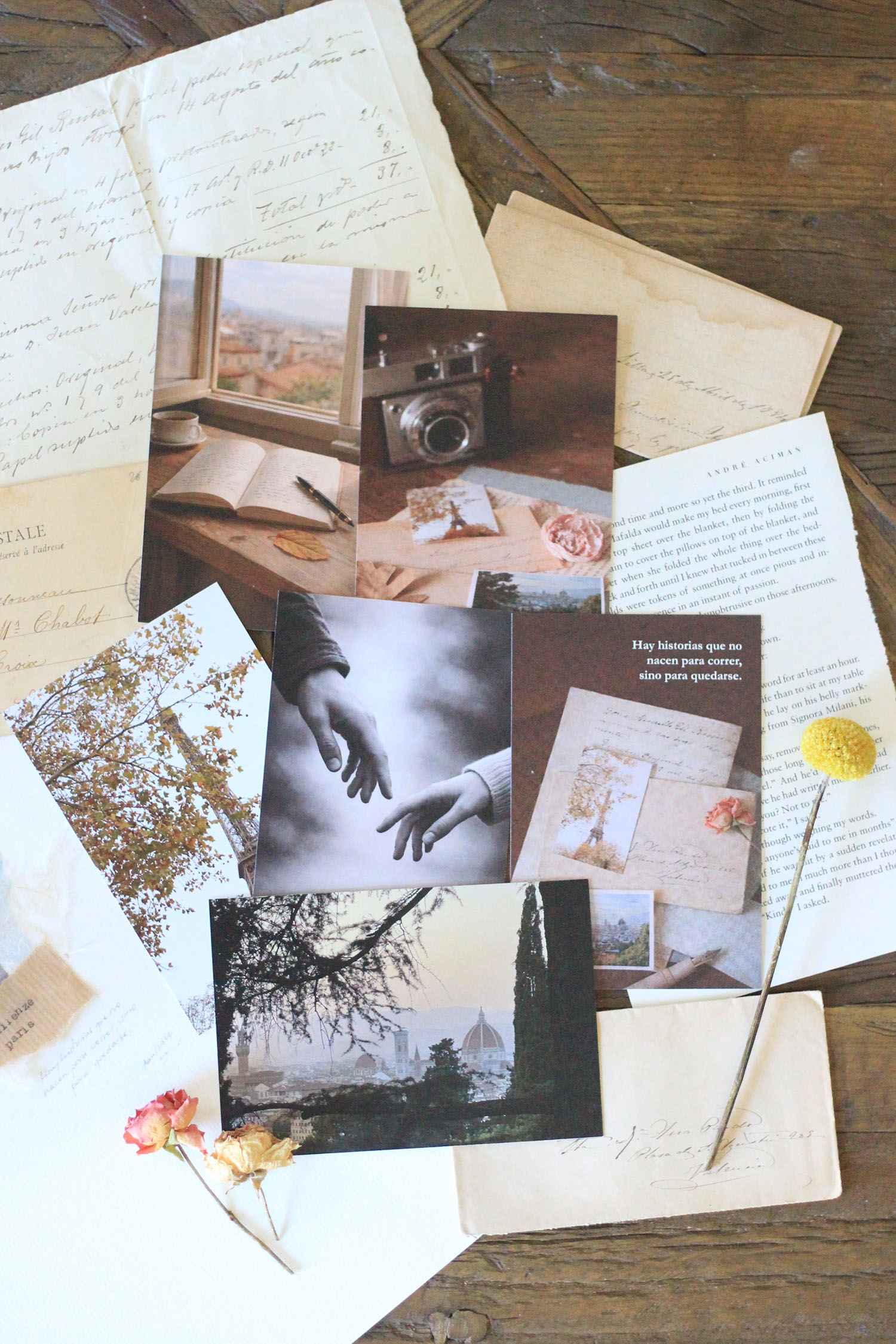 Realizar los collages ha sido un proceso precioso. Cada uno de ellos está hecho de fragmentos que, de alguna forma, también cuentan esta historia. Hay papeles que vienen de libros. Algunos de Llámame por tu nombre y Recuérdame, de André Aciman. Un ejemplar que encontré en un charity en Londres, imperfecto y hermoso, que con el tiempo terminó deshaciéndose hasta convertirse en pequeños tesoros. Sin saberlo entonces, acabarían aquí.