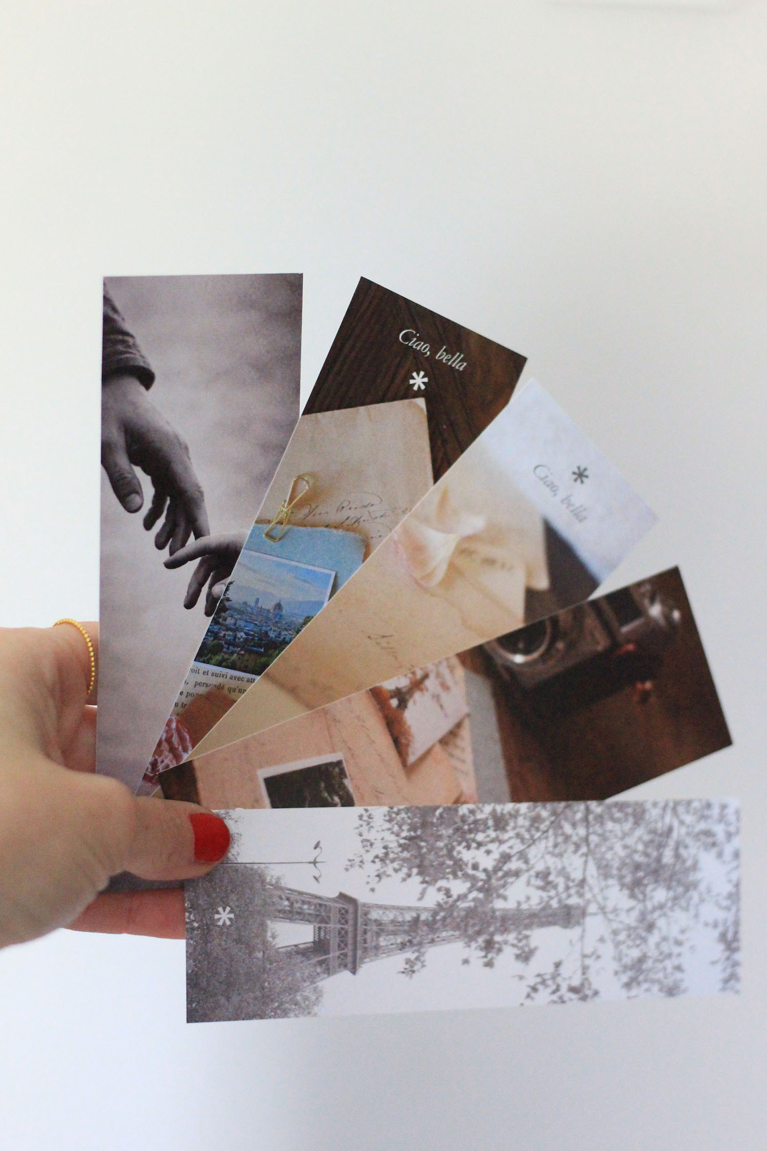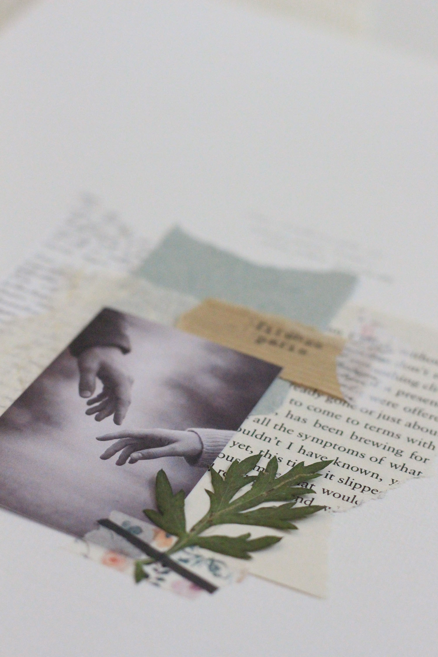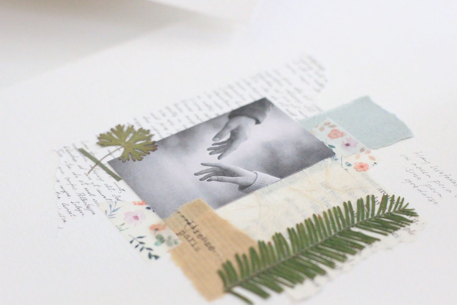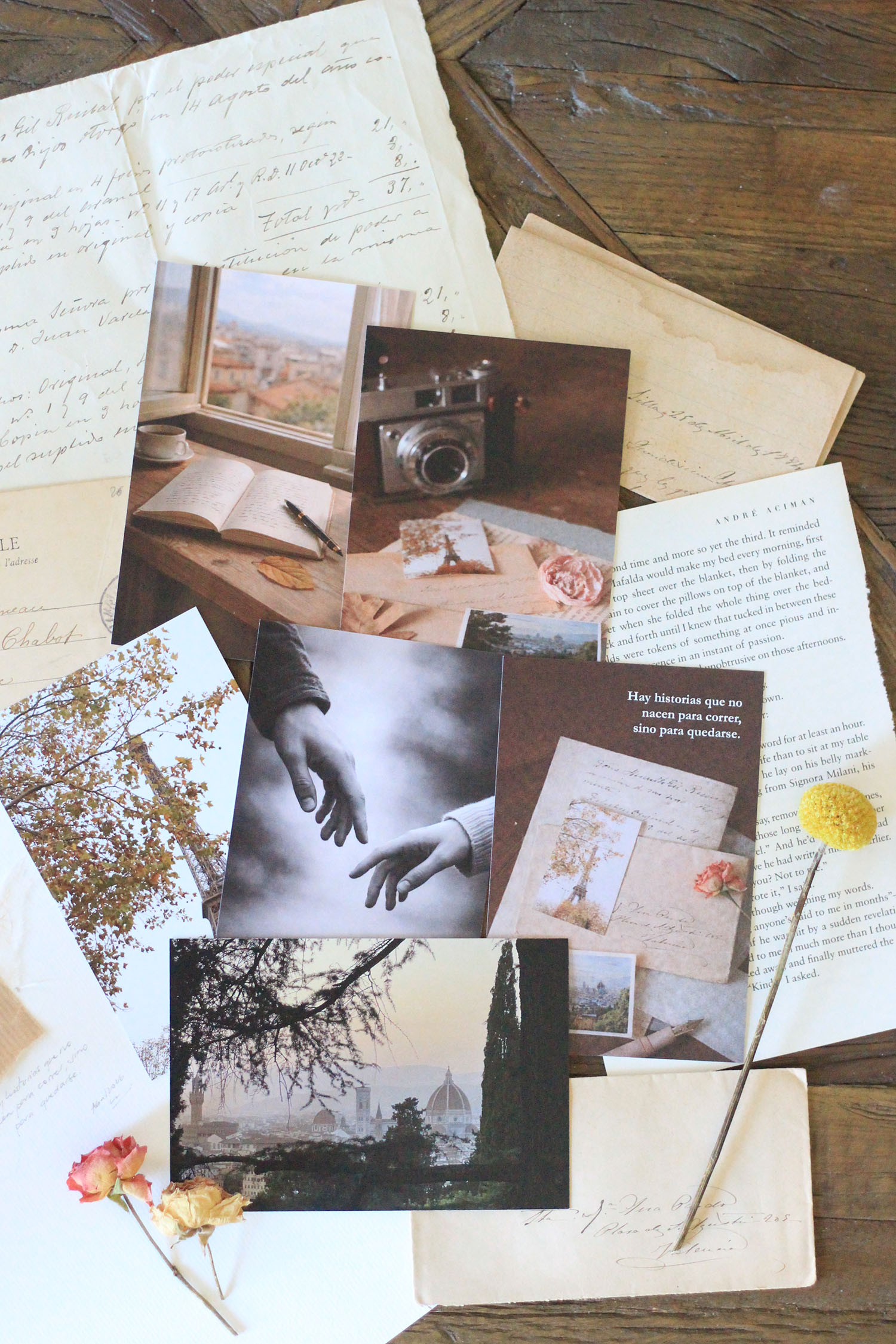 También hay un papel de fibras de algodón que compré en Florencia. Es allí, en la plaza del Duomo, donde todo comienza. La imagen es la misma que la de la portada: dos manos a punto de rozarse, de elegirse. Y en cada collage hay una hoja o una pequeña rama prensada. La naturaleza, el paso del tiempo… y algo que quizá entiendas al leer la historia.