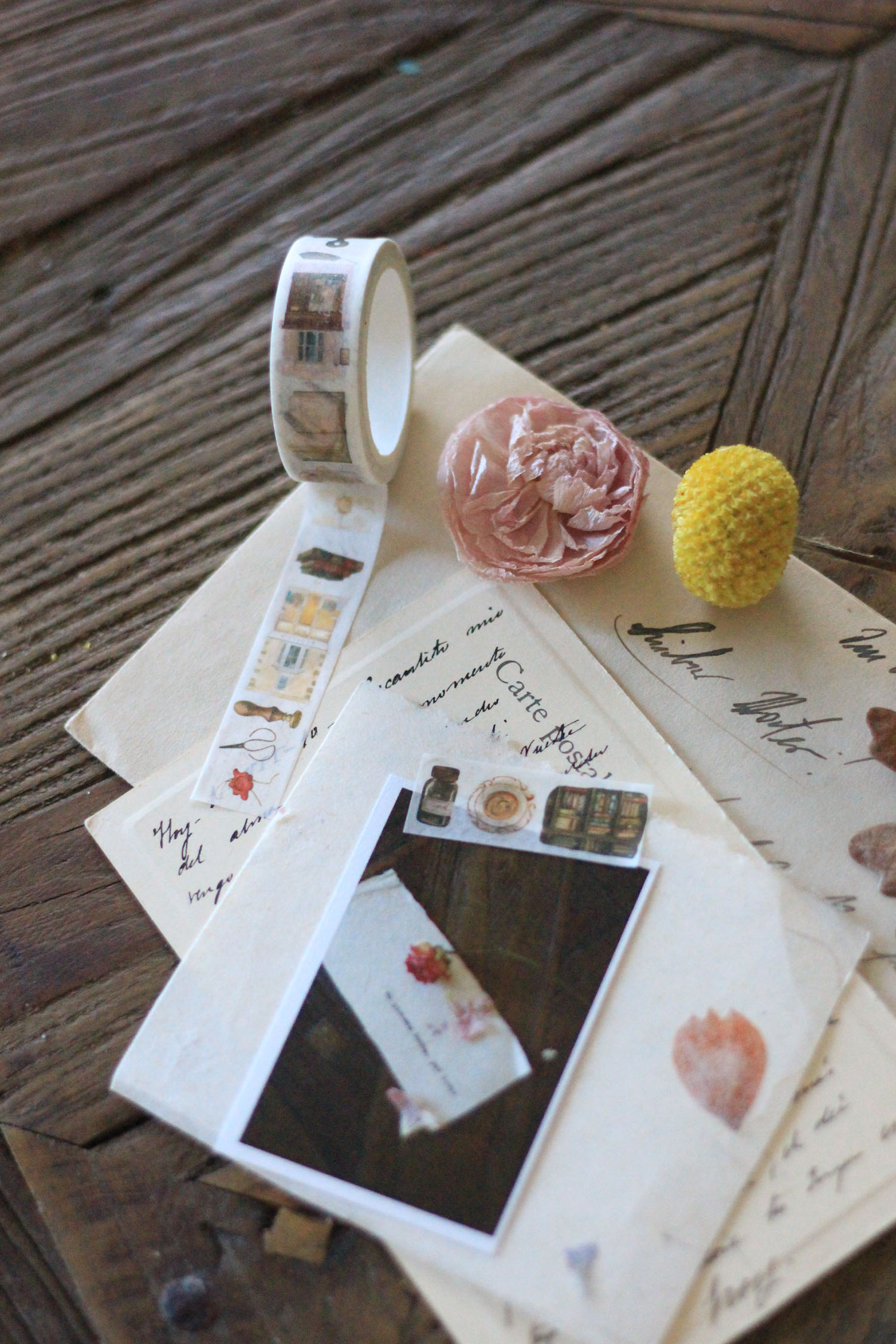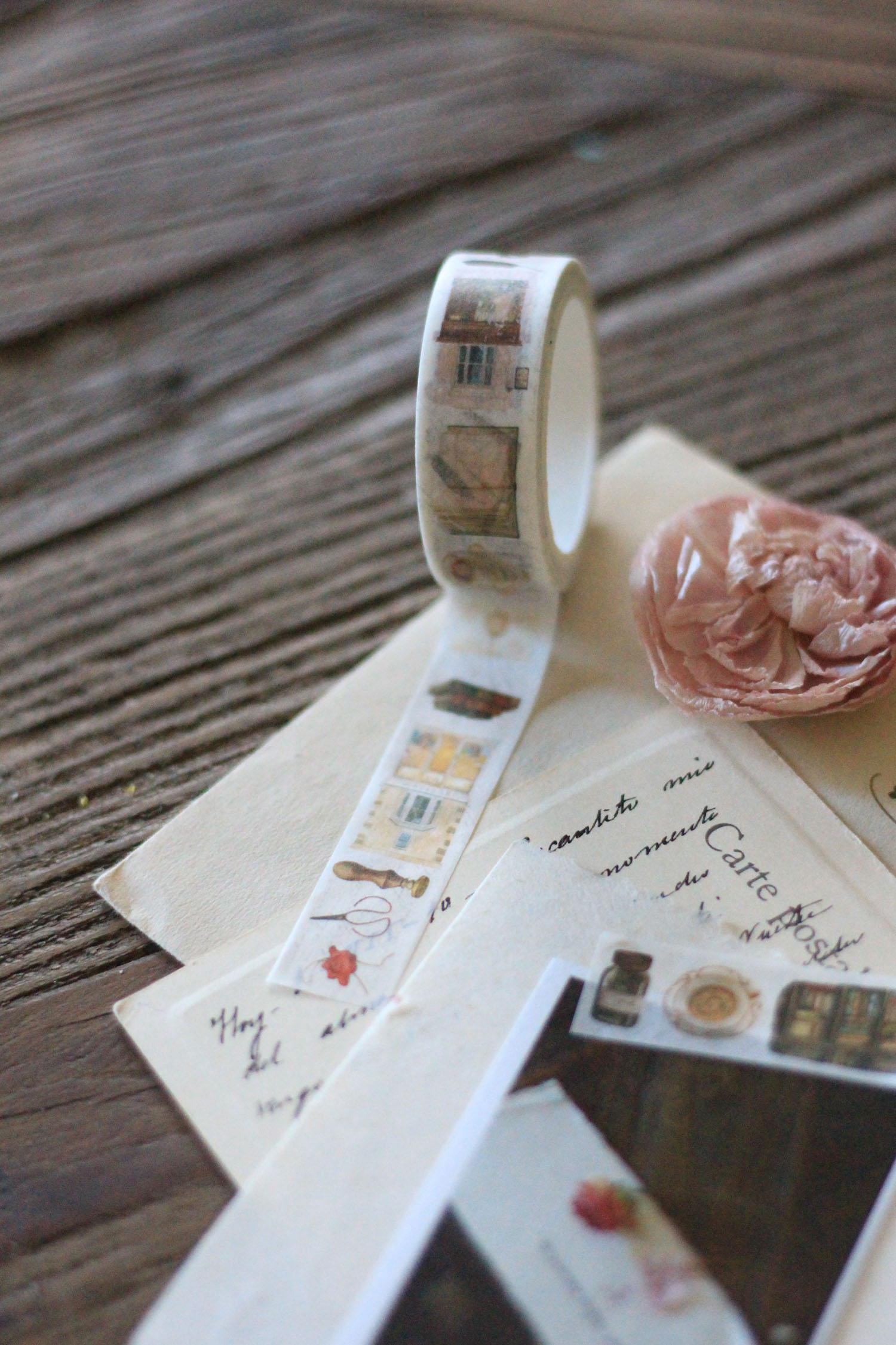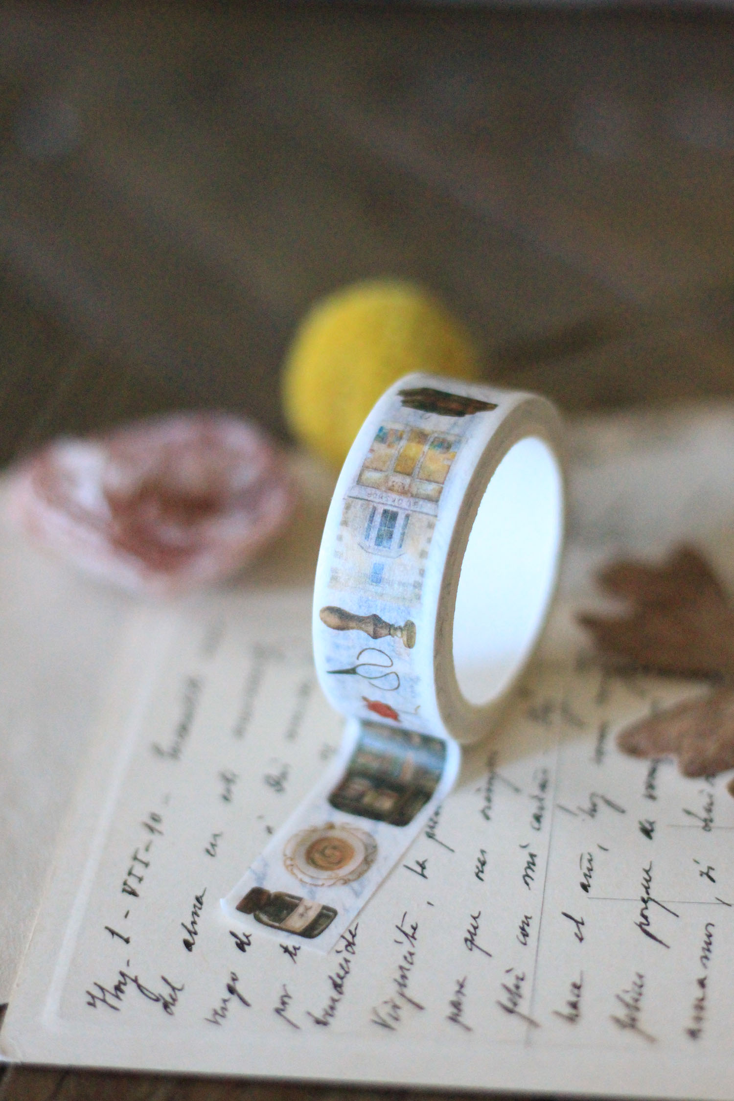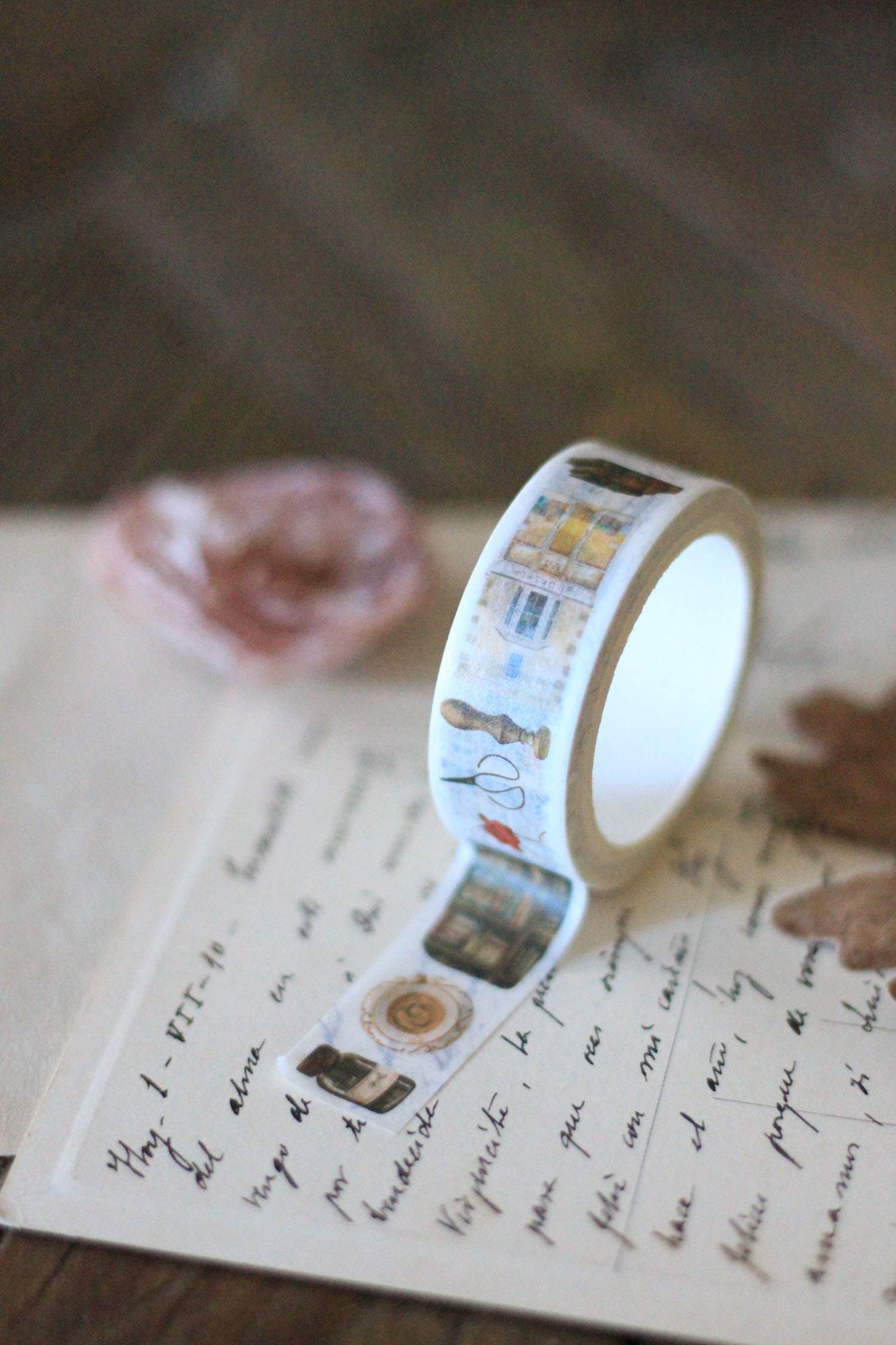 Rollo de cinta washi de 15 mm de ancho por 10 m de largo. Es un diseño cuidado con elementos postales y las preciosas ilustraciones relacionadas con el mudo de los libros y de la papelería con un toque vintage: fachadas, volúmenes, cartas, lacres… Ilustraciones de LichuArtShop.